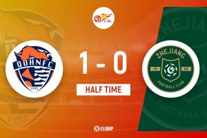 上半場(chǎng)補(bǔ)時(shí)4分鐘。半場(chǎng)戰(zhàn)罷,青島海牛1-0浙江隊(duì)。