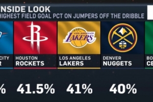體育資訊3月21日訊 今天,美媒曬出了本賽季運球后跳投命中率最高前五,具體為: