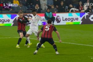 英超第31輪,曼聯(lián)客戰(zhàn)伯恩茅斯。67分鐘,阿瑪?shù)陆麉^(qū)內(nèi)倒地,裁判沒有表示。伯恩茅斯隨后發(fā)動反擊扳平比分。