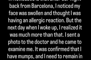 “我把照片發(fā)給醫(yī)生,他過來對我進行了檢查。結(jié)果證實我患有腮腺炎,需要隔離5天,并在更長時間內(nèi)停止體力活動。我現(xiàn)在專注于康復(fù),爭取盡快恢復(fù)到100%的狀態(tài)?!?/p>
