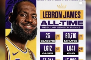 詹姆斯轉(zhuǎn)發(fā)了NBA官方賬號(hào)發(fā)布的他生涯各項(xiàng)數(shù)據(jù)紀(jì)錄的歷史排名,并評(píng)論道:“無(wú)比幸福?。?!?????”