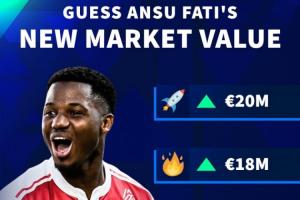 法蒂當(dāng)前身價(jià)1000萬(wàn)歐,德轉(zhuǎn)給出了四個(gè)可能的數(shù)字:1200萬(wàn)、1500萬(wàn)、1800萬(wàn)、2000萬(wàn)。法甲聯(lián)賽身價(jià)將于本月27日更新。