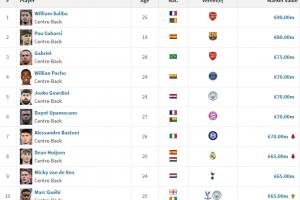 最新全球中后衛(wèi)身價(jià)排名(單位:歐元)↓