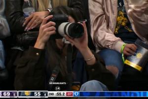 體育資訊3月26日訊 NBA常規(guī)賽,步行者對陣湖人,克拉克客串場邊的攝影師。