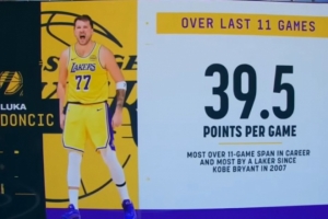 據(jù)統(tǒng)計,連續(xù)11場比賽場均39.5分創(chuàng)造了東契奇生涯最高紀錄,也是湖人隊史繼2007年科比以來最高!