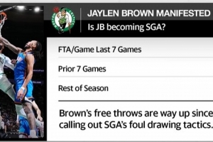 據(jù)統(tǒng)計,布朗從吐槽亞歷山大罰球起的7場比賽,場均11.6次罰球,而在這之前的7場場均8.4罰,賽季場均6.9罰。