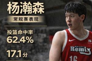 楊瀚森在常規(guī)賽出戰(zhàn)了14場,投籃命中率62.4%,三分球32.1%,罰球命中率75%,場均17.1分9.2籃板3.1助攻0.7助攻1.6蓋帽。