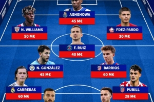 中場:尼科·岡薩雷斯(4500萬歐)、法比安·魯伊斯(4000萬歐)、巴里奧斯(6000萬歐)