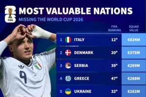 體育資訊4月2日訊 德國(guó)轉(zhuǎn)會(huì)市場(chǎng)列出了無(wú)緣世界杯球隊(duì)身價(jià)排名,意大利8.34億歐居首,丹麥、塞爾維亞二三位。
