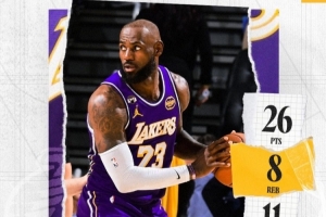 本場(chǎng)比賽,湖人球星詹姆斯上場(chǎng)32分鐘,17投11中得到26分8籃板11助攻2搶斷1蓋帽。