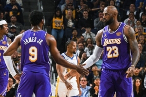 賽后湖人發(fā)布贏球海報,封面為詹姆斯和布朗尼父子擊掌瞬間。