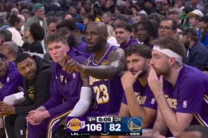 GIF——詹姆斯致場邊球迷:“放輕松,好好看球?!保ā癥ou need to relax. Watch the game.”)