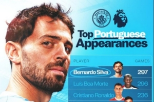 體育資訊4月12日訊 本輪英超將迎來焦點戰(zhàn)曼城對陣切爾西,B席本場首發(fā)出場,這是他第297次英超出場,創(chuàng)造了葡萄牙球員在該項賽事歷史紀(jì)錄,以下為具體榜單: