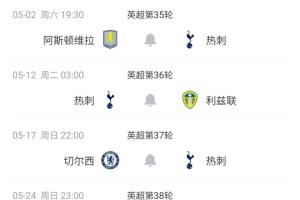 在剩余的最后6輪比賽中,熱刺三個主場三個客場,將客場對陣維拉、切爾西,最后一輪主場對陣埃弗頓。