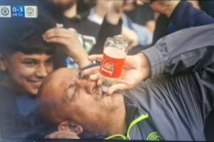 體育資訊04月13日訊 英超第32輪,曼城客場(chǎng)3-0完勝切爾西。比賽過程中轉(zhuǎn)播鏡頭對(duì)準(zhǔn)了看臺(tái)上的一位曼城球迷,他拿著印有阿森納標(biāo)志的水瓶瘋狂嘲諷慶祝,瞬間走紅。
