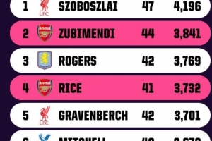 體育資訊4月17日訊 OPTA對英超球員本賽季各項(xiàng)賽事出場時間進(jìn)行了統(tǒng)計(jì),利物浦的索博斯洛伊以4196分鐘居首,阿森納兩將蘇維門迪和賴斯位居第2和第4位,兩人出場時間分別為3841分鐘和3732分鐘。