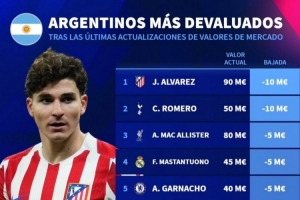 阿根廷球員身價(jià)下跌榜:阿爾瓦雷斯、羅梅羅下跌1000萬(wàn)歐最多