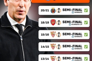 執(zhí)教以來(lái),維拉主帥埃梅里已經(jīng)7次闖進(jìn)歐聯(lián)杯半決賽,他本賽季有望奪得第5個(gè)歐聯(lián)杯冠軍。除了率領(lǐng)維拉闖進(jìn)歐聯(lián)杯半決賽外,埃梅里還曾率領(lǐng)瓦倫西亞、塞維利亞(3次)、阿森納以及比利亞雷亞爾闖進(jìn)歐聯(lián)杯半決賽。