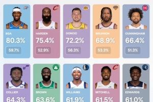 注:要求球員至少出戰(zhàn)40場,上場時(shí)間至少20分鐘