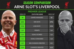 25-26賽季:32輪,勝率47%、負(fù)率31%,場(chǎng)均1.6分,場(chǎng)均1.6進(jìn)球、1.3失球,場(chǎng)均創(chuàng)造2.1重大機(jī)會(huì)、創(chuàng)造12.3機(jī)會(huì),凈勝球+10,場(chǎng)均對(duì)方禁區(qū)內(nèi)觸球35次,聯(lián)賽排名第5