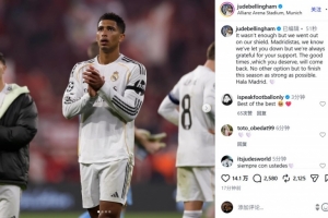 體育資訊4月18日訊 本輪歐冠八強戰(zhàn)次回合,皇馬在客場3-4被拜仁雙殺。中場貝林厄姆在賽后通過社媒發(fā)文。