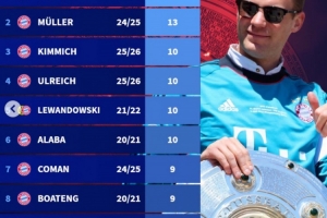 體育資訊4月20日訊 德甲第30輪比賽,拜仁以4-2的比分戰(zhàn)勝斯圖加特鎖定本賽季的德甲冠軍,諾伊爾、基米希、烏爾賴希等人再添一個(gè)德甲冠軍獎(jiǎng)牌。德國轉(zhuǎn)會市場盤點(diǎn)了球員德甲獲得德甲冠軍的數(shù)量,諾伊爾和穆勒均拿到13個(gè)德甲冠軍并列榜首,前10均為拜仁球員。