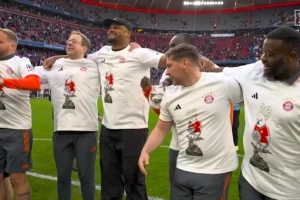 今天凌晨,拜仁4-2擊敗斯圖加特,將隊(duì)史第35座聯(lián)賽冠軍完美收入囊中。賽后,安聯(lián)球場(chǎng)內(nèi)洋溢著狂歡的氣氛,而主角是一件極其特別的紀(jì)念衫。