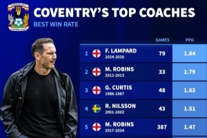 蘭帕德執(zhí)教考文垂以來(lái)帶隊(duì)參加79場(chǎng)比賽,場(chǎng)均拿到1.84分,考文垂歷任主帥場(chǎng)均拿分最多(至少執(zhí)教30場(chǎng))。