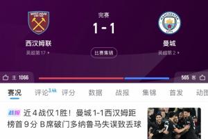 3月15日,曼城客場1-1戰(zhàn)平西漢姆聯(lián),同輪阿森納2-0擊敗埃弗頓。曼城在少賽一場的情況下落后阿森納多達(dá)9分。
