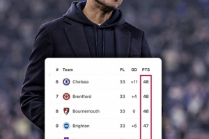 在英超積分榜上,切爾西以48分位居第6,但僅僅領(lǐng)先位居第12的富勒姆3分,而且布倫特福德和伯恩茅斯和藍軍積分相同。