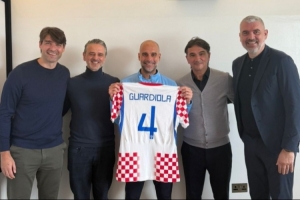 隨達利奇一同造訪曼徹斯特的還有技術總監(jiān)普萊蒂科薩以及教練組成員喬爾盧卡、盧卡·米蘭諾維奇,代表團向瓜迪奧拉贈送了一件其專屬的克羅地亞國家隊4號球衣以及一副定制的國際象棋。