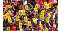 體育資訊04月25日訊 英超第34輪,利物浦vs水晶宮,比賽第13分鐘,利物浦主場球迷集體舉起黃牌,抗議芬威未來三個(gè)賽季提高票價(jià)的決定。