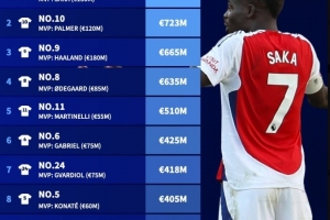 1、7號(薩卡,身價1.5億歐):總市場價值7.71億歐