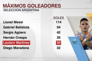 體育資訊10月15日訊 勞塔羅在阿根廷隊大勝波多黎各的友誼賽中梅開二度,根據(jù)ESPN統(tǒng)計,勞塔羅阿根廷隊進球數(shù)追平克雷斯波,并列隊史第四。