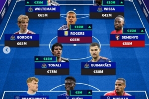 中場(chǎng):戈登(紐卡,6500萬(wàn)歐元)、托納利(紐卡,7500萬(wàn)歐元)、摩根-羅杰斯(維拉,6500萬(wàn)歐元)、吉馬良斯(紐卡,8000萬(wàn)歐元)、塞梅尼奧(伯恩茅斯,5500萬(wàn)歐元)
