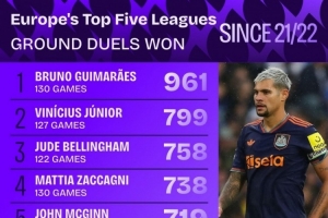 全文摘要:Squawka統(tǒng)計(jì)了2021-22賽季以來(lái)五大聯(lián)賽球員地面對(duì)抗成功次數(shù)。紐卡球員吉馬良斯以961次成功高居榜首,皇馬的維尼修斯(799次)和多特的貝林厄姆(758次)分列二、三位。該榜單展現(xiàn)了球員在比賽中的身體對(duì)抗能力。