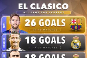 國家德比歷史射手榜,梅西26球遙遙領(lǐng)先,C羅、迪斯蒂法諾18球并列第2,本澤馬16球,勞爾15球,TOP5僅1名巴薩球員。