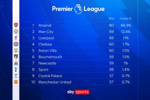 根據(jù)Opta目前的最新預(yù)測(cè),如果阿森納及其爭(zhēng)冠對(duì)手繼續(xù)這樣踢下去,那么槍手只需70分即可奪冠。