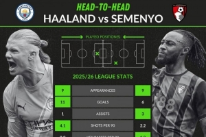 體育資訊11月3日訊 本輪英超,曼城將主場(chǎng)對(duì)陣伯恩茅斯。賽前WhoScored列出了兩隊(duì)主要得分手哈蘭德和塞梅尼奧的數(shù)據(jù)對(duì)比。
