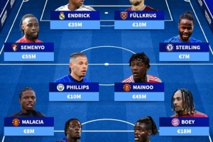 中場:塞梅尼奧(伯恩茅斯,5500萬)、卡爾文·菲利普斯(曼城,1000萬)、梅努(曼聯(lián),4500萬)、斯特林(切爾西,700萬)