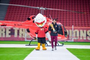 激動人心的奪冠視頻過后,大家的目光被靜候在內(nèi)場的臨港捷運紀(jì)念版直升機吸引,儀式開始前,這架直升機載著王燊超和獎杯從川沙飛抵球場。這一環(huán)節(jié)不僅是榮耀的展示,更是俱樂部積極探索“低空+足球”體旅融合新范式的生動實踐。隨后,王燊超與俱樂部總經(jīng)理沙良昌共同將新賽季冠軍獎杯安放于柱頂,與三座往屆火神杯組成“冠軍獎杯矩陣”,將現(xiàn)場氛圍推向高潮。