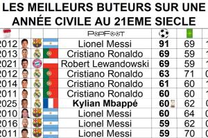 12月份皇馬還剩下5場比賽可踢,姆巴佩有機(jī)會(huì)沖擊C羅和萊萬的年度69球,梅西在2012年的91球依舊難以企及。