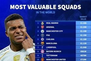 全文摘要:德轉(zhuǎn)更新球員身價,俱樂部排名出爐?;蜀R以13.8億歐高居榜首,阿森納(12.9億)、曼城(11.9億)分列二、三位。切爾西、巴薩、利物浦等豪門緊隨其后,曼聯(lián)位列第十。